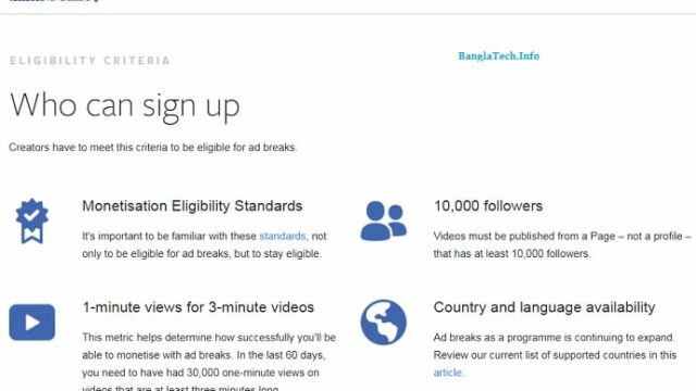 Facebook এ আয় করার এই নতুন পদ্ধতি টিকে বলা হয়, “Facebook video monetization এবং ad breaks“. এই, ad breaks বা ভিডিও monetization এর কিছু নিয়ম বা যোগ্যতা রয়েছে, যেগুলি পুরো করলে আপনারা এর ব্যবহার করে ফেসবুক থেকে টাকা আয় করতে পারবেন।