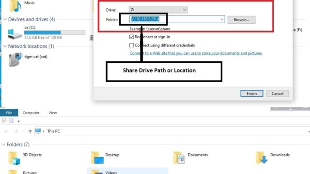 প্রথমে আপনি Desktop এর This PC তে প্রবেশ করেন, উপরের দিকে মেনু বার এর file Computer, View নামে তিনটি ট্যাবের আপনি Computer ট্যাব এ ক্লিক করুন, এখন Map network drive এর down arrow তে ক্লিক করুন। দুই টা অপশন আসবে আপনি Map network drive অপশন টা সিলেক্ট করুন। এই খানে দুই টা অপশন আসবে Drive & Folder.