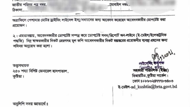 বিআরটিএ'র লাইসেন্সিং কর্তৃপক্ষ উক্ত আবেদন ফরমে স্বাক্ষর এবং সিল লাগিয়ে দিয়ে একটি স্মারক নাম্বার বসিয়ে দেবেন। তারপর আবেদন ফরমের এক সেট বিআরটিএ অফিস রেখে দেবেন এবং একসেট আবেদনকারীকে দিয়ে দেবেন। আবেদনকারী ফরমটি নিয়ে সংশ্লিস্ট সরকারি হাসপাতালে চলে যাবেন। হাসপাতালের প্যাথলজি বিভাগে ৯০০ টাকা টিকিট কেটে ডোক টেস্ট করানো যাবে। ডোপ টেস্ট হয়ে গেলে হাসপাতাল কর্তৃপক্ষ ই-মেইলের মাধ্যমে বিআরটিএ কর্তৃপক্ষের কাছে একটি কপি পাঠিয়ে দেবেন। এবং ৭২ ঘণ্টা পর আবেদনকারীকে একটি হার্ডকপি দিয়ে দেবেন।