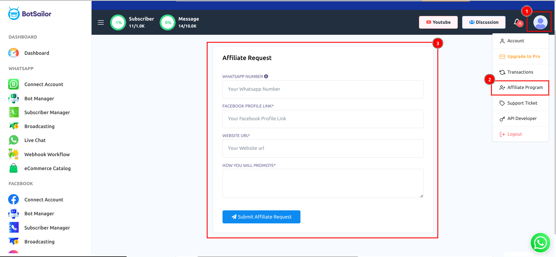 অ্যাফিলিয়েট হিসেবে আবেদনের জন্যে হোয়াটসঅ্যাপ নাম্বার, ফেসবুক প্রোফাইল লিঙ্ক এবং আপনার ওয়েবসাইট এর লিঙ্ক দিতে হবে। তারপরের ধাপে How You Will Promote বক্সে উল্লেখ করতে হবে যে আপনি একজন মার্কেটার হিসেবে কিভাবে BotSailor এর প্রোমোশন করবেন। অ্যাফিলিয়েট রিকুয়েস্ট সাবমিট করার কিছু সময়ের মধ্যেই আপনি আপনার অ্যাফিলিয়েট ড্যাশবোর্ডে আপনার অ্যাফিলিয়েট লিঙ্ক, ওয়েবসাইটের জন্যে অ্যাড ব্যানার পেয়ে যাবেন যেগুলো আপনাকে ব্যবহার করতে হবে।