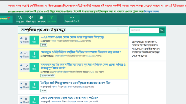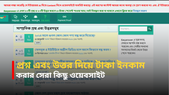 প্রশ্নোত্তর করে টাকা ইনকাম করার জন্য আমি সবার প্রথমে যে ওয়েবসাইটটিকে রেখেছি তার নাম হলো Easyanswer। এই ওয়েবসাইটটি আমার কাছে টাকা ইনকামের জন্য সবচেয়ে সেরা ওয়েবসাইট বলে মনে হয়েছে। এবং আমি নিজেও এখান থেকে টাকা ইনকাম করেছি। আর বাংলাদেশে যতগুলো প্রশ্ন উত্তর ওয়েবসাইট আছে তার মধ্যে সবথেকে সহজে এবং সব থেকে বেশি টাকা এই ওয়েবসাইটি দিয়ে থাকে। অন্যান্য ওয়েবসাইটগুলো থেকে টাকা ইনকাম করার জন্য অনেকগুলো শর্ত বা অনেক নিয়ম কানুন মেনে চলতে হয়। কিন্তু এই ওয়েবসাইটে টাকা ইনকামের জন্য কেমন কোনো শর্ত নেই। শুধু একটি অ্যাকাউন্ট খুলে প্রশ্নোত্তর করে আপনি টাকা ইনকাম করতে পারবেন। তবে আপনার প্রশ্ন উত্তর ওয়েবসাইট কর্তৃপক্ষ এপ্রুভ করার পরেই আপনি সেই প্রশ্নের উত্তরের জন্য কিছু পয়েন্ট পাবেন। আর উপরে বর্ণিত নিয়ম গুলো মেনেই তারা প্রশ্ন কিংবা উত্তর এপ্রুভ করে থাকে। তাই প্রশ্ন উত্তর করার পূর্বে আপনাকে অবশ্যই উপরের নিয়ম গুলো মেনে চলতে হবে। Registration Link: Easyanswer