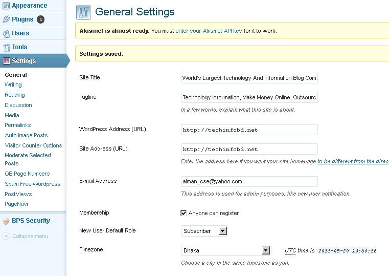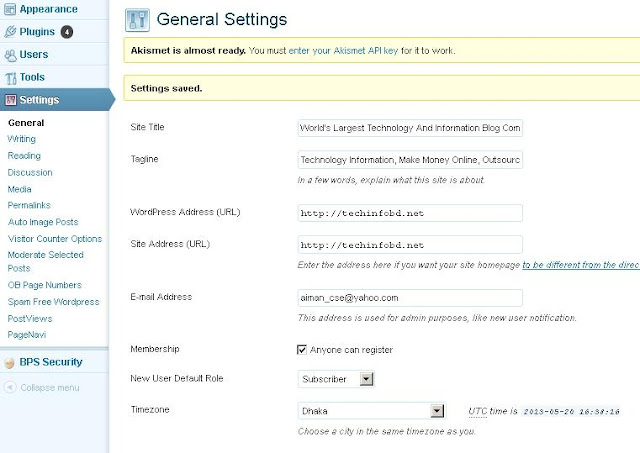 সেটিং-এ গিয়ে জেনারেল-এ গিয়ে আপনার সাইট এর টাইটেল এবং ডেসক্রিপশন দিন । আপনি যদি চান আপনার সাইটে যে কেউ রেজিষ্ট্রেশন করতে পারবে তবে এনি ওয়ান ক্যান রেজিষ্টার অপশনটিকে টিক চিহ্ন দিয়ে সেভ করুন ।