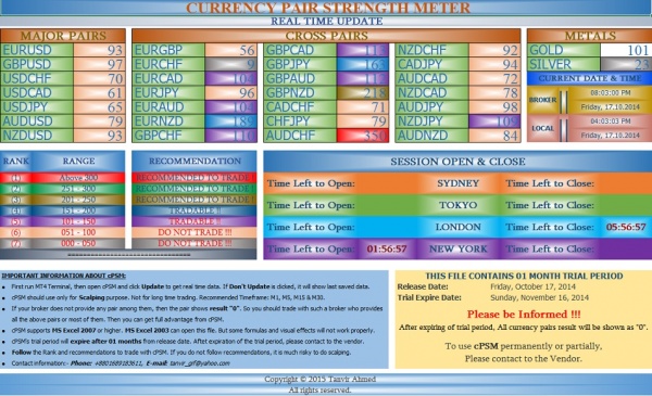[cPSM বা Currency Pair Strength Meter মাইক্রোসফট এক্সেলে তৈরি একটি এক্সটার্নাল রুলস। এটি MT4 টার্মিনালের সাথে লিঙ্ক তৈরি করে ফরেক্স মার্কেটের ৩০টি কারেন্সি পেয়ারের ডেইলি রেঞ্জ ও স্ক্যলপিংয়ের জন্য উপযুক্ত পেয়ারের রিকমেন্ডেশনসহ সেশন ওপেন ও ক্লোজ হতে অবশিষ্ট সময়ের হিসাব প্রদর্শন করে। cPSM ওপেন করার জন্য মাইক্রোসফট এক্সেল ২০০৭ বা এর ঊর্ধ্বের কোনো ভার্সন ব্যবহার করুন।]