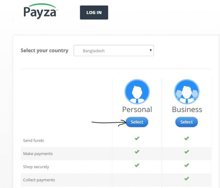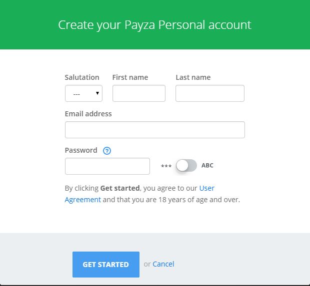 Personal এ Select করলেই নিচের ছবির মত দেখা যাবে আপনার First Name Last Name, Email, Password দিয়ে GET STARTED এ ক্লিক করে এগিয়ে যান, Email verification এর জন্য Payza আপনাকে একটা মেইল পাঠাবে, আপনার email Inbox check করে verify করুন।