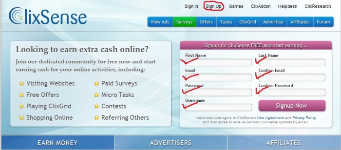 ১। প্রথমে আপনাকে এই সাইটে রেজিস্ট্রেষন করতে হবে। রেজিস্ট্রেষণ করতে singup লিঙ্কে ক্লিক করুন । Clixsens