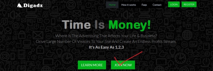 ১। প্রথমে আপনাকে এই সাইটে রেজিস্ট্রেষন করতে হবে। রেজিস্ট্রেষণ করতে join now লিঙ্কে ক্লিক করুন । Digadzs