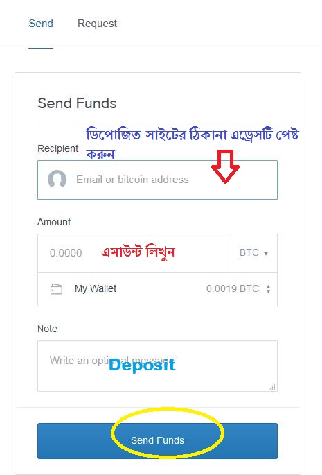 ৫। Deposit করার জন্য আপনাকে কয়েন বেইজ সাইটে লগইন করতে হবে (যদি একউন্ট করা থাকে) সেখান হতে কত পরিমান বিট কয়েন সেন্ড করতে চান তাহা উল্লেখ করে এই ইনভেস্টমেন্ট সাইটের ঠিকানাতে প্রেরন করুন।
