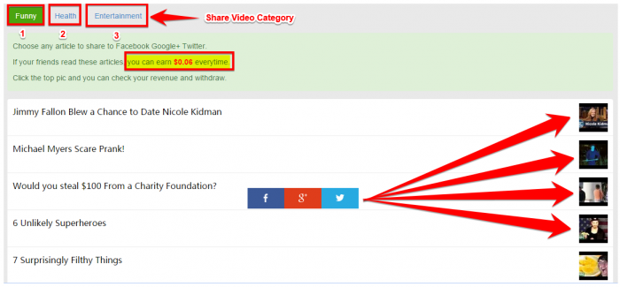 এখন সেই ভিডিও গুলো নিচে লোগো দেওয়া ফেসবুক, গুগল প্লাস ও টুইটার এ শেয়ার করুন যদি আপনার বন্ধুরা এই ভিডিও গুলোর লিঙ্ক এ ভিজিট করে তাহলে আপনি প্রতি ভিজিট এর জন্য ০.০৬$ ডলার পাবেন এবং ১৮ জন বন্ধু যদি আপনার ভিডিও টি দেখে তাহলেই আপনি প্রথম পেমেন্ট তুলতে পারবেন ২$ কারন তারা আপনাকে ১ ডলার বোনাস দিয়েছিল। আপনি যদি প্রতি দিন ৫০০ ভিজিটর নিতে পারেন আপনার শেয়ার করা লিঙ্ক এ তাহলে আপনি ৫০০ * ০.০৬ =৩০ ডলার পাবেন এবং লিঙ্ক গুলো ও ভিজিটর অবশ্যই ফেসবুক, গুগল প্লাস ও টুইটার থেকে হতে হবে।