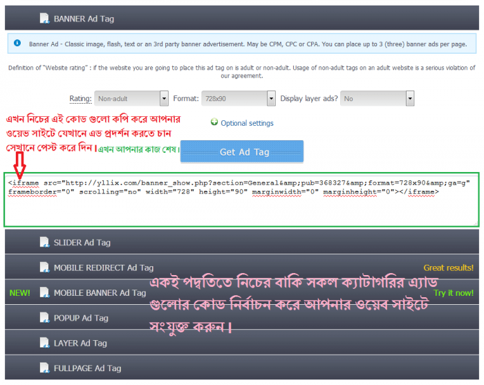 এখন দেখবেন Get Ad Tag বাটনের নিচে কিছু কোড আসবে সেগুলো কপি করে নিয়ে আপনার ওয়েব সাইটের যেখানে অ্যাড প্রদর্শন করতে ছান সেখানে বসিয়ে দিন। এখন আপনার কাজ শেষ…