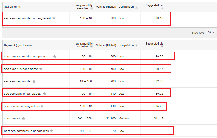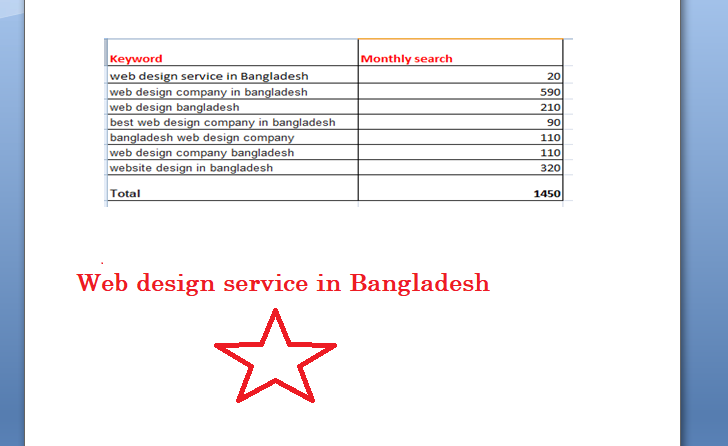 উপরোক্ত ৬টি কী-ওয়ার্ড নিয়ে গুগলে প্রতি মাসে মোট সার্চ হয়(২৬০+৫৯০+১১০+১৪০+৫৯০+৭০) =১৭৬০ টি