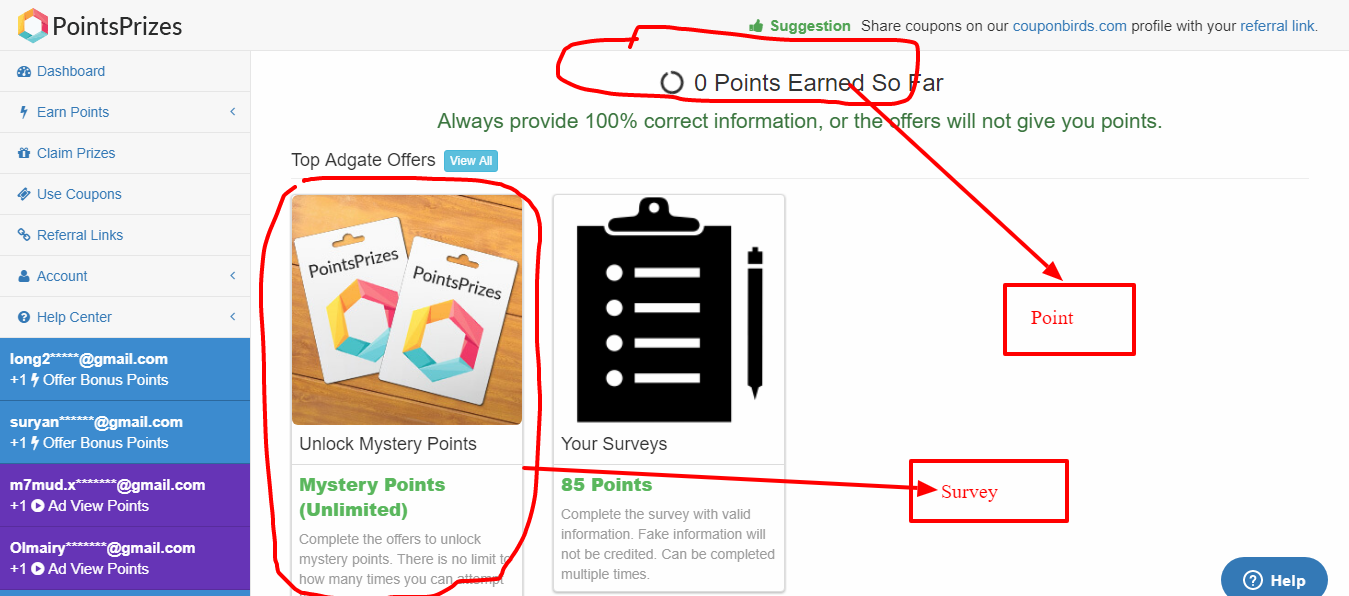 ৪. এর পর সবগুলো সার্ভের উপর ক্লিক করুন। দেখবেন আপনার অ্যাকাউন্টে পয়েন্ট জমা হচ্ছে। এখান থেকে আপনি ২০০-৩৫০ পয়েন্ট পাবেন।