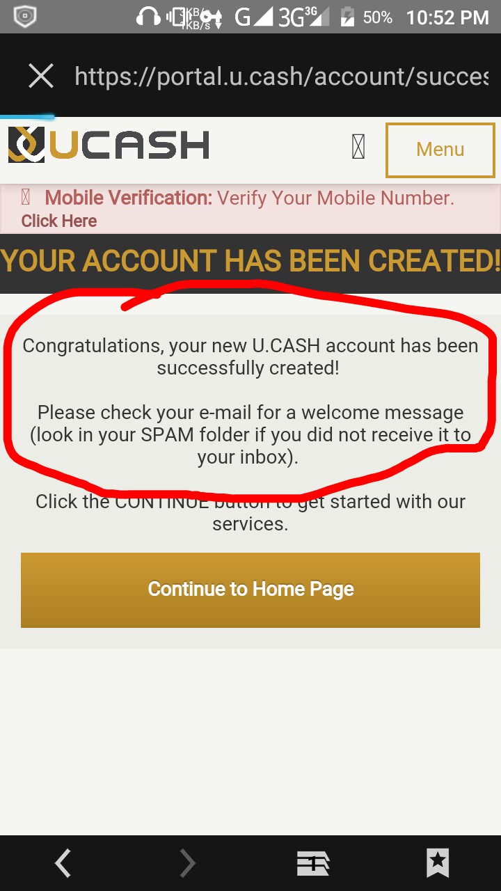 Congratulations, you new U.CASH Account hass been Successfully Created.