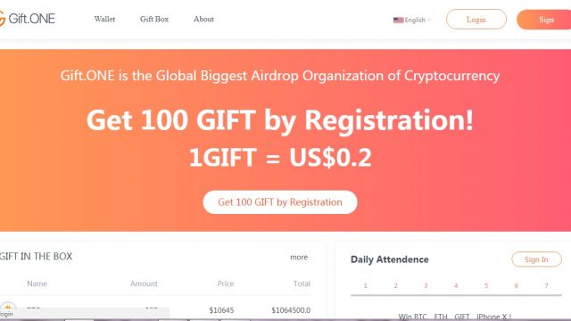 Gift.ONE, the global biggest airdrop organization of cryptocurrency, is airdropping million Tokens! 1GIFT = US$0.2, get 100GIFT by registration, Gain more 100000GIFT from any activities, Click link to get GIFT: https://gift.one/i/5916681007 Win lottery for iPhoneX、BTC、ETH、GIFT everyday!