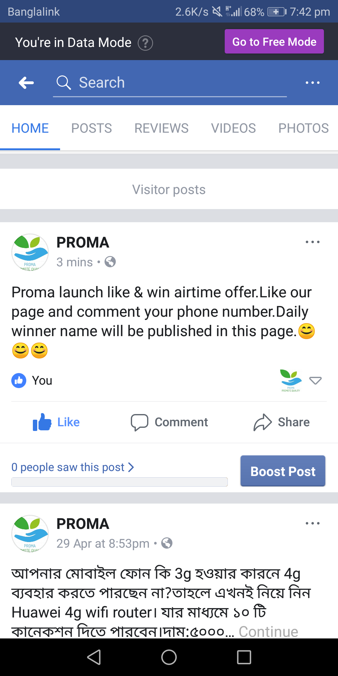 • proma অনলাইন শপ এর পেজে লাইক দিয়ে জিতে নিন ফ্রি ফ্লেক্সিলোড প্রতিদিন। https://www.facebook.com/promaworld/ page এ লাইক দিয়ে আপনার নাম্বার ইনবক্স করুন। প্রতিদিন বিজয়ীদের ফ্লেক্সিলোড দেয়া হবে।