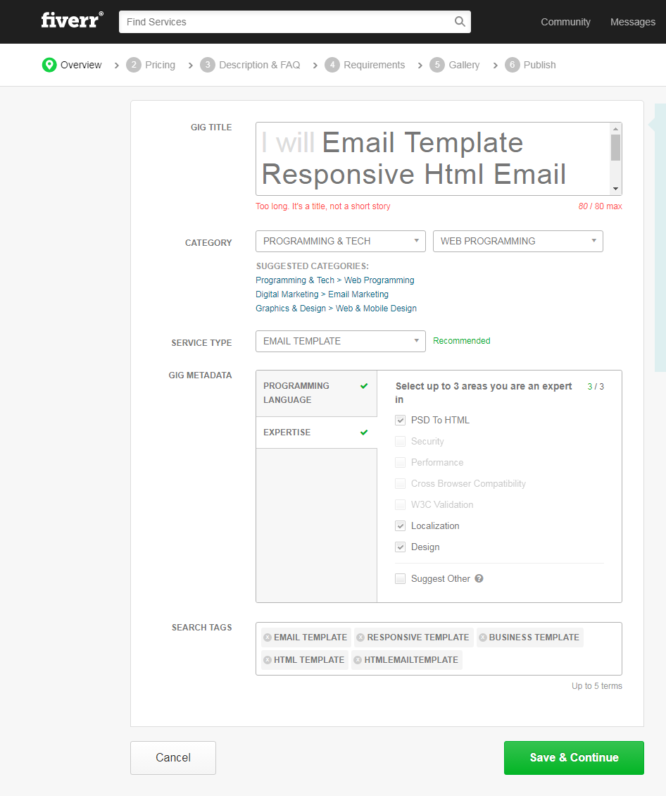 নোটঃ টাইটেল টা বড় হয়ে গেছে? এখন কি করবেন? আর যতগুলো গিগ দেখলেন সবগুলো থেকে এইরকম গিগ তো আর দেখা যায় নি তাহলে উপায় কি? হ্যা, উপায় আছে, এখন টাইটেল বড় কিন্তু গিগ কমপ্লিটলি তৈরী করার পর সেটার টাইটেল চেঞ্জ করে নিন। যেমন “Create Awesome Responsive Email Template For You Business Or Anythings” মানে যেভাবে যাকে দেখাতে চান। আর হ্যা, আগের লম্বা টাইটেল এর কাজ হচ্ছে লিংক বা URL তৈরী করা যা এস ই ও তে ভূমিকা রাখে অনেক।
