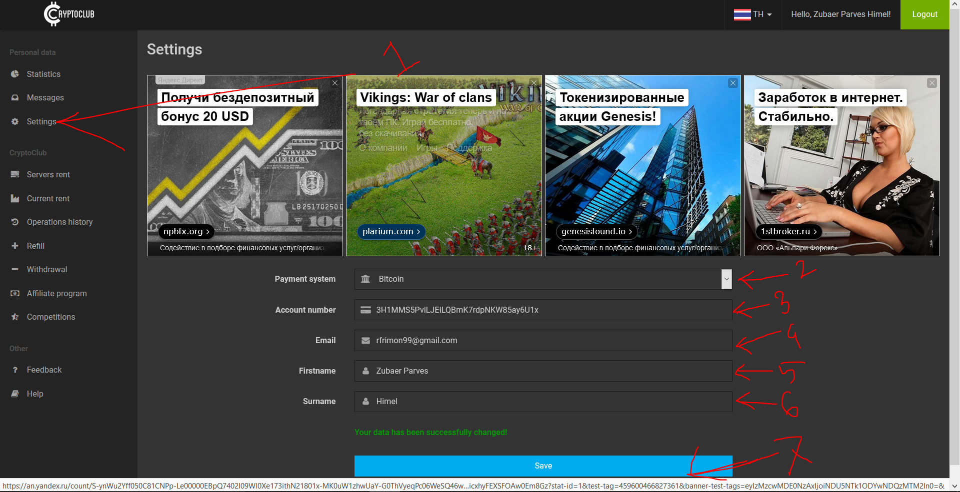 প্রথমে ১ নাম্বারে ক্লিক করবেন। করার পরে ২ নাম্বারে ক্লিক করে পেমেন্ট মেথড বিটকয়েন সিলেক্ট করবেন। তারপরে ৩ নাম্বারে আপনার বিটকয়েন ওয়ালেট এড্রেস দিবেন। ৪ নাম্বারে আপনার ইমেইল এড্রেস দিবেন। ৫ নাম্বারে আপনার ফার্স্ট নেইম এবং ৬ নাম্বারে আপনার লাস্ট নেইম দিয়ে ৭ নাম্বারে সেভ বাটনে ক্লিক করে সেভ করে দিবেন।