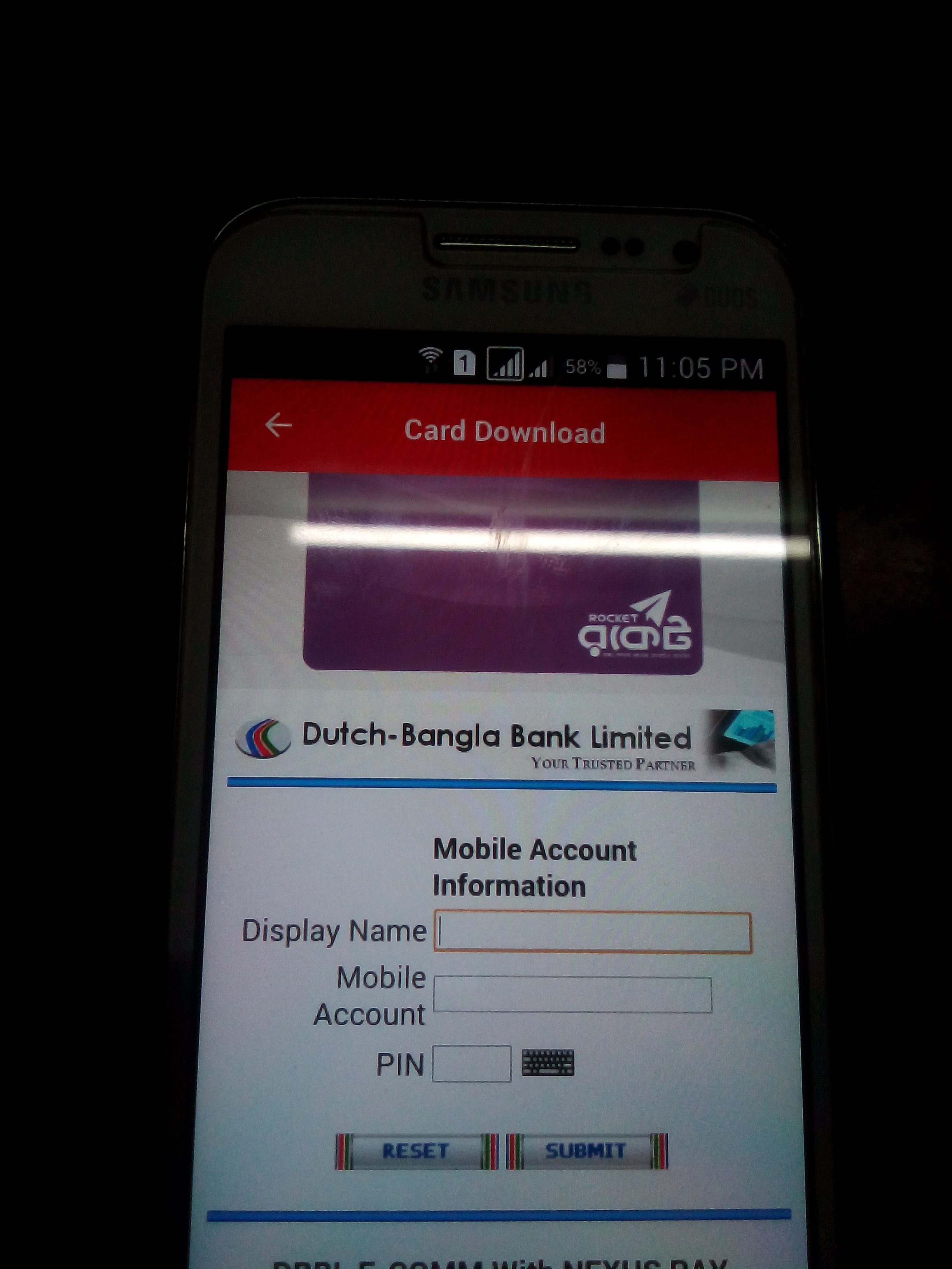 কিছু সময় অপেক্ষা করলে নিচের মত একটা ফর্ম আসবে ওইটাই আপনার নাম, Mobile Account(রকেট একাউন্ট নাম্বার) এবং রকেট একাউন্ট পিন দিয়ে Submit দিন।