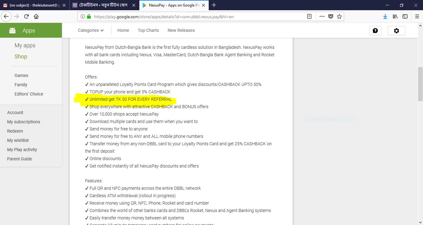 সম্প্রতি ডাচ-বাংলা ব্যাংক চালু করেছে NexusPay App টি কেউ যদি রেফারেল করে তাহলে প্রতি রেফারেলের জন্য ৫০ টাকা করে বোনাস দেওয়া হবে। কিন্তু এই কাজটি করার জন্য অবশ্যই আপনার Dutch-Bangla Bank Agent Banking, Rocket Mobile Banking, DBBL Bank Account থাকতে হবে।