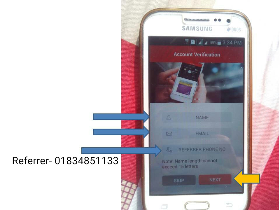 ৪। এরপর নিচের ছবির মত আপনার নাম, ইমেইল এবং Referrer Phone No এর জায়গায় 01834851133 দিয়ে Next দিন।