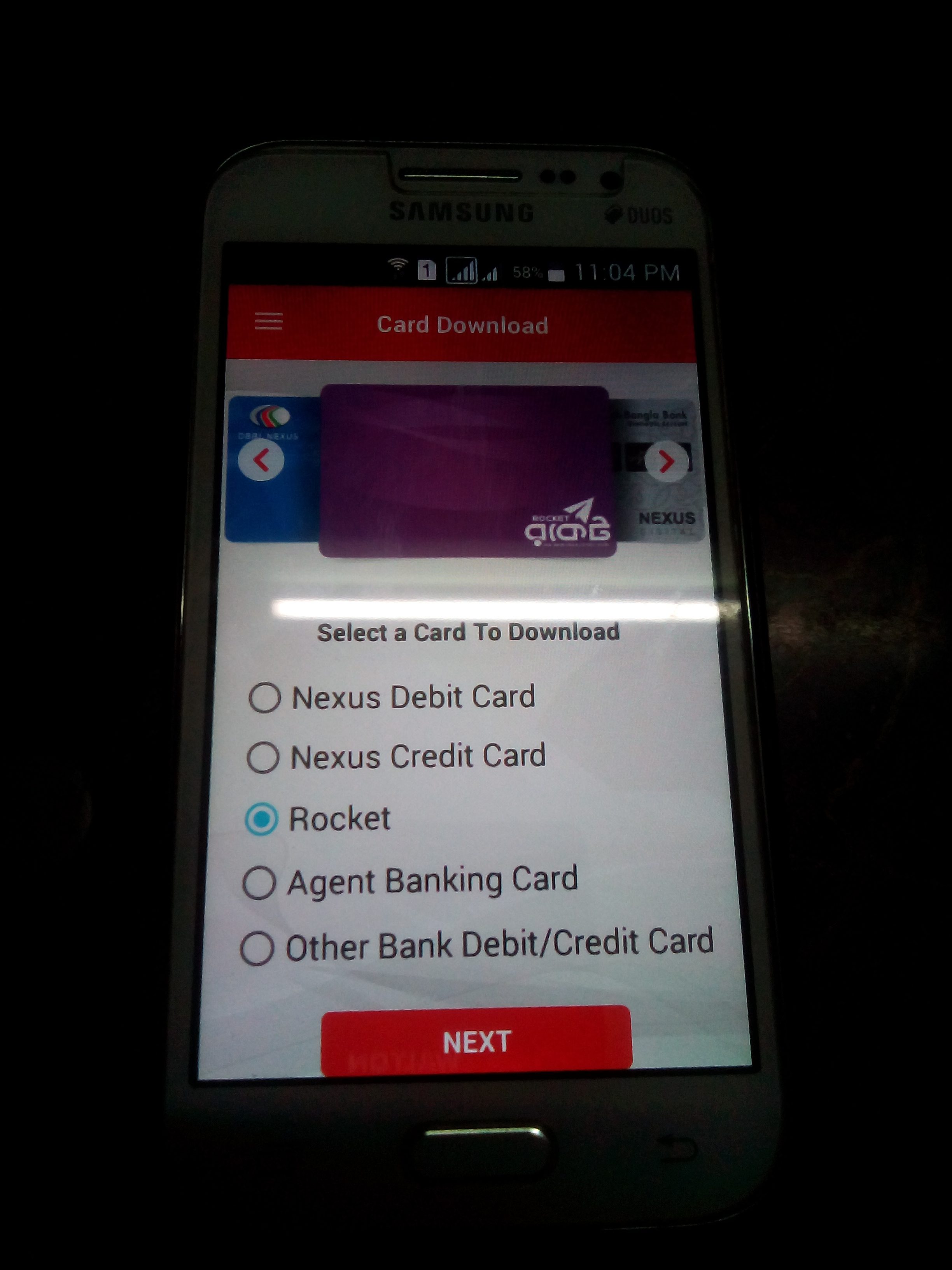 ৫। এরপর আপনার পছন্দের মত কার্ড সিলেক্ট করে ওই অনুযায়ী NexusPay এর মাধ্যমে পছন্দের ভার্চুয়াল কার্ড বানিয়ে নিন আপনার জন্য। আমি এখানে রকেট একাউন্ট NexusPay App এ লিংক করা দেখিয়ে দিব।