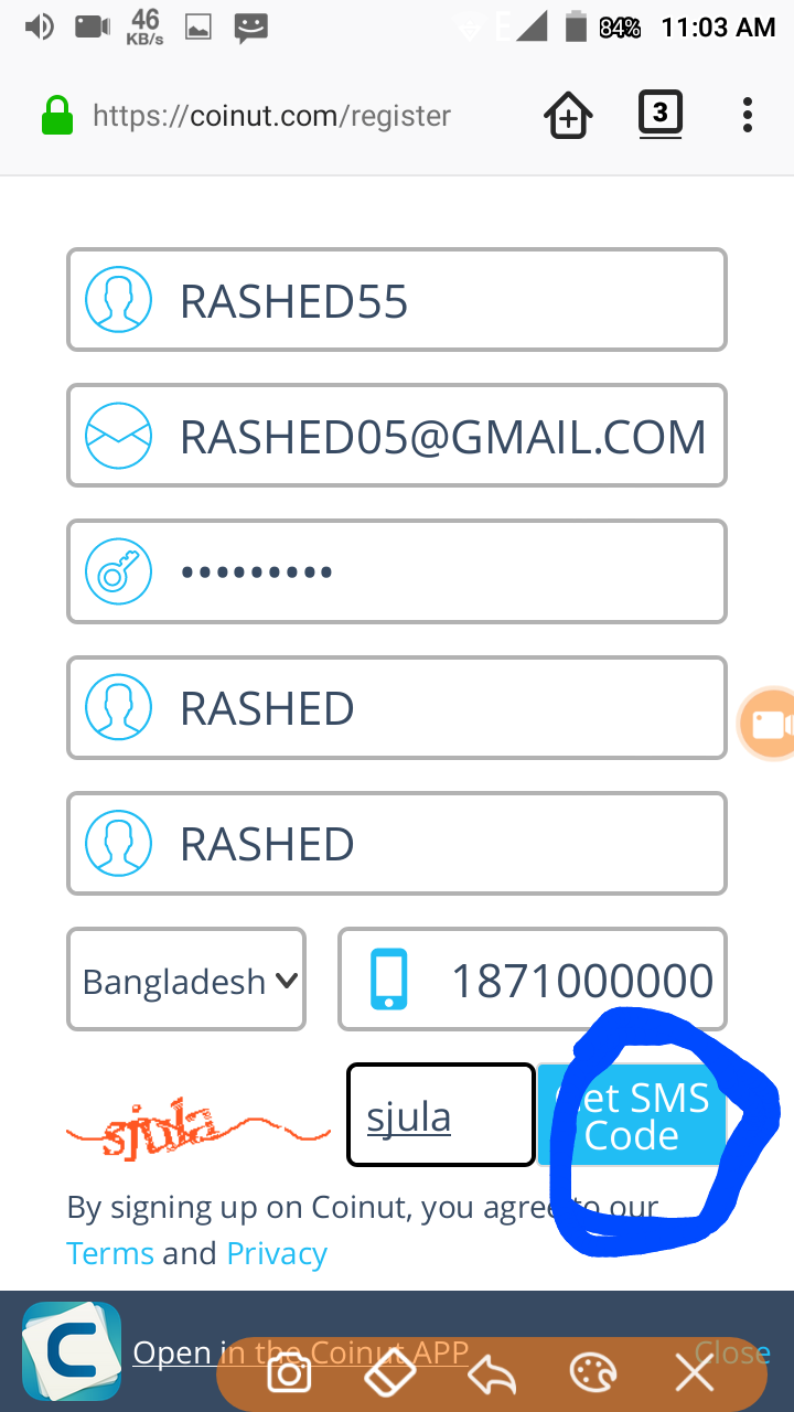এবার খুব ভালো করে ছবিটা খেয়াল করুন। আমি যে ভাবে ফর্মটা পুরন করেছি। আপনারা আপনাদের জিমেইল ও ফোন নাম্বার দিবেন। পাসওয়ার্ড এই ভাবে দিবেন =rashed1234। দিয়ে নিল দেখানো স্থানে ক্লিক করবেন। এরপরে আপনার নাাম্বারে একটা কোড আসবে। আপনারা ঐ কোড দিয়ে ভেরিফাই করে নিবেন
