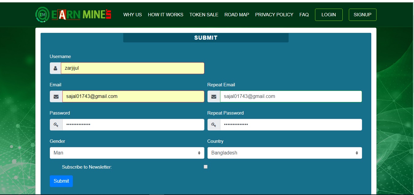 এখানে আপনার ইউজারনেম, ই-মেইল, পাসওয়ার্ড দিয়ে সাবমিট এ ক্লিক করুন এরকম ভাবে