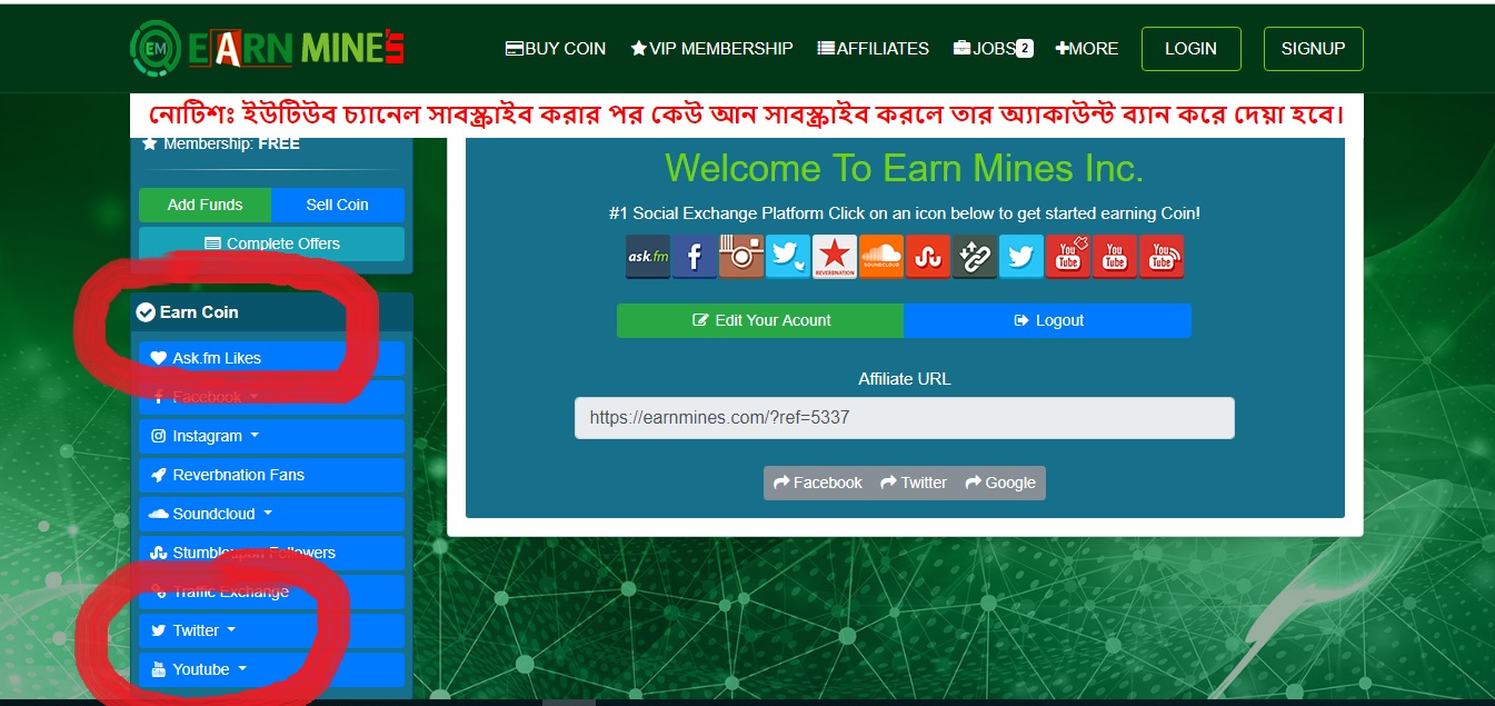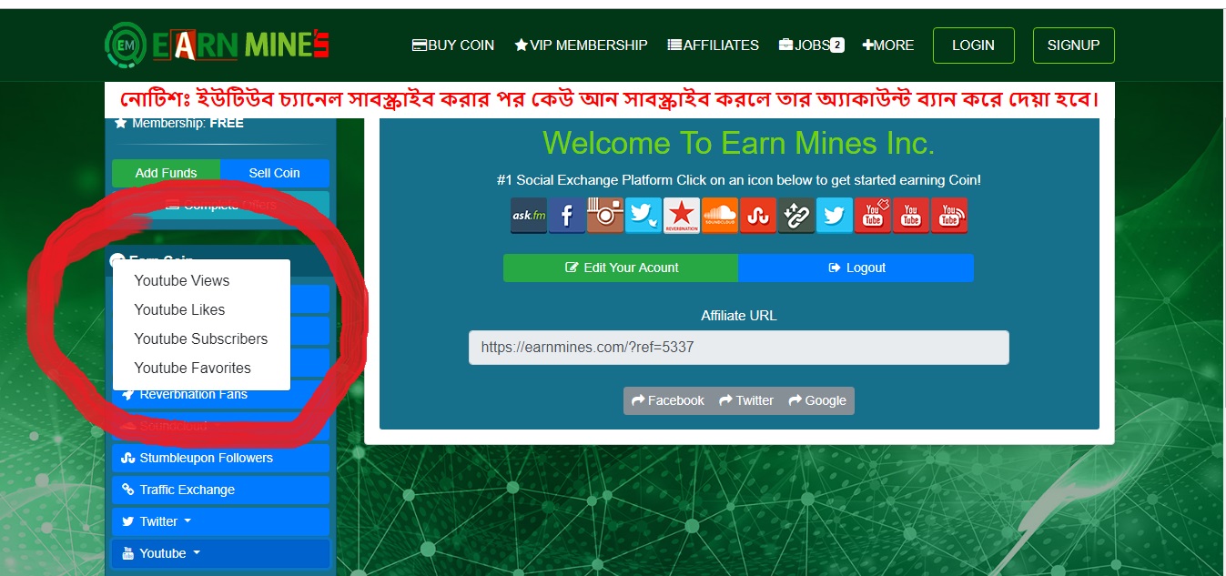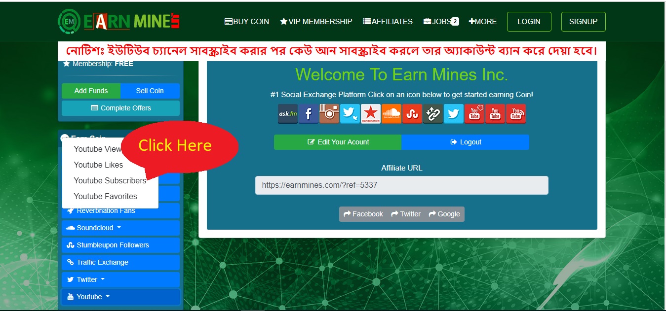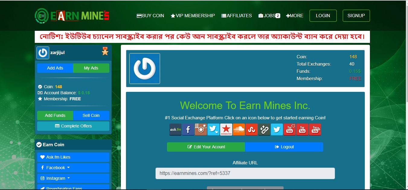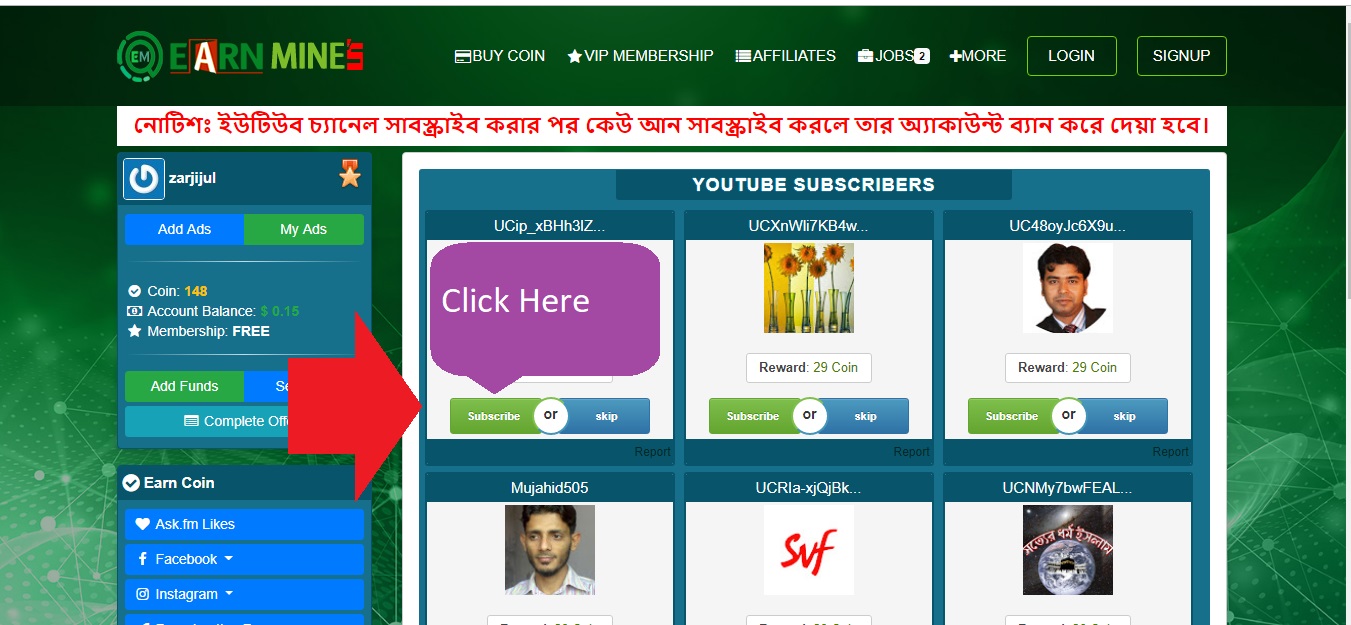 আজকে যে সাইটটি আপনাদের সাথে শেয়ার করতেছি এই সাইটটির নাম হল আর্ন মাইন্স এটি অনেক ভাল একটি সাইট এটা থেকে আমি ৫০ টার মত সাবস্ক্রাইব পেয়েছি সেগুলো রিয়েল সাবস্ক্রাইব এবং সবগুলো বাংলাদেশের সাবস্ক্রাইব
