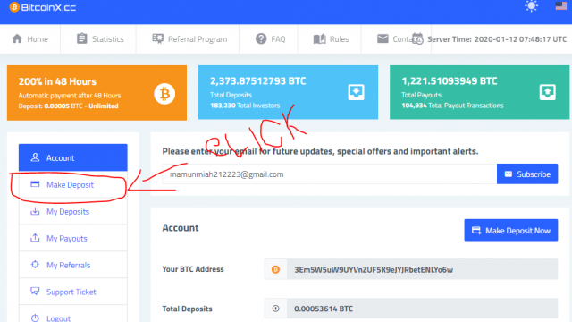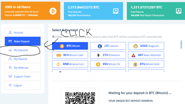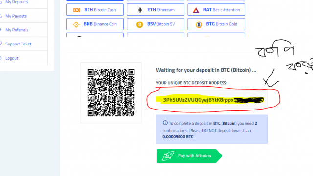 ২য় ধাপঃ Make Deposit অপশনে গিয়ে দেখবে যে একটি বিটকয়েন ওয়ালেট এড্রেস দিয়েছে।