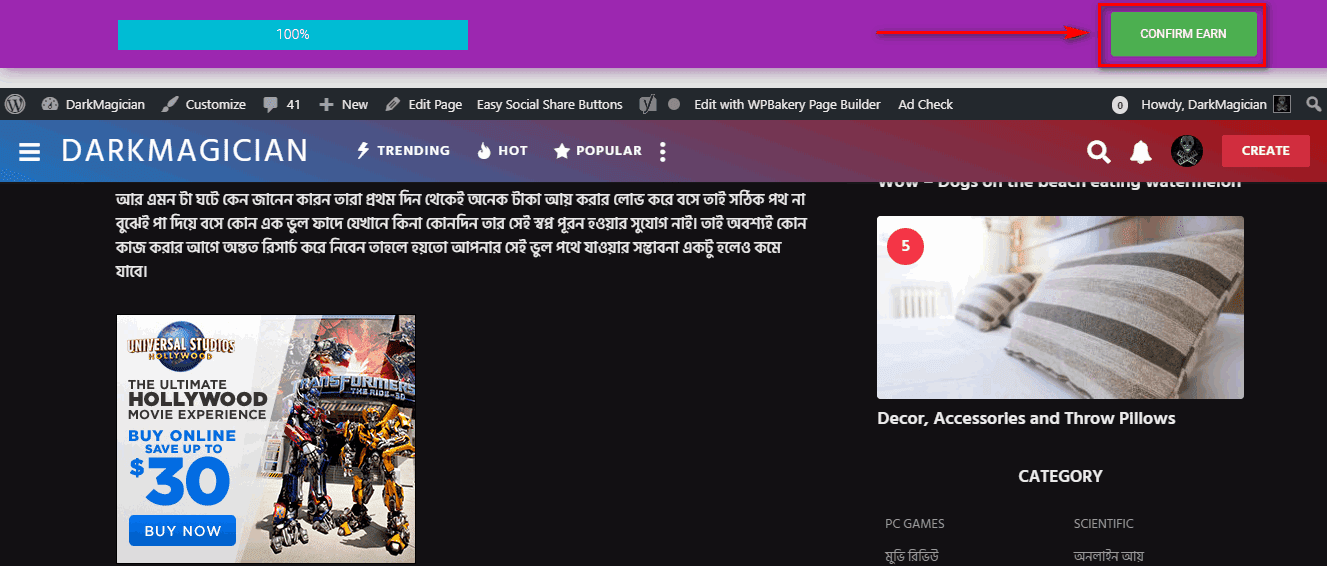 এরপর আপনি একটি সবুজ বাটন দেখতে পাবেন যেখানে Confirm Earn লেখা থাকবে তাতে ক্লিক করুন ব্যস হয়ে গেলো একটি লিংক ভিজিট করা আর সাথে একাউন্টে ব্যালেন্স যুক্ত হওয়া। আর এভাবেই আপনাকে বাকী বিজ্ঞাপণ গুলোতে গিয়ে ক্লিক করে বসে থাকতে হবে এবং Loading সম্পূর্ণ হয়ে গেলে সবুজ বাটনে চেপে দিতে হবে আর এটাই হচ্ছে এখানে আপনার Paid To Click এর কাজ বাকী গুলোও কিছুদিনের মধ্যে যুক্ত হয়ে যাবে।