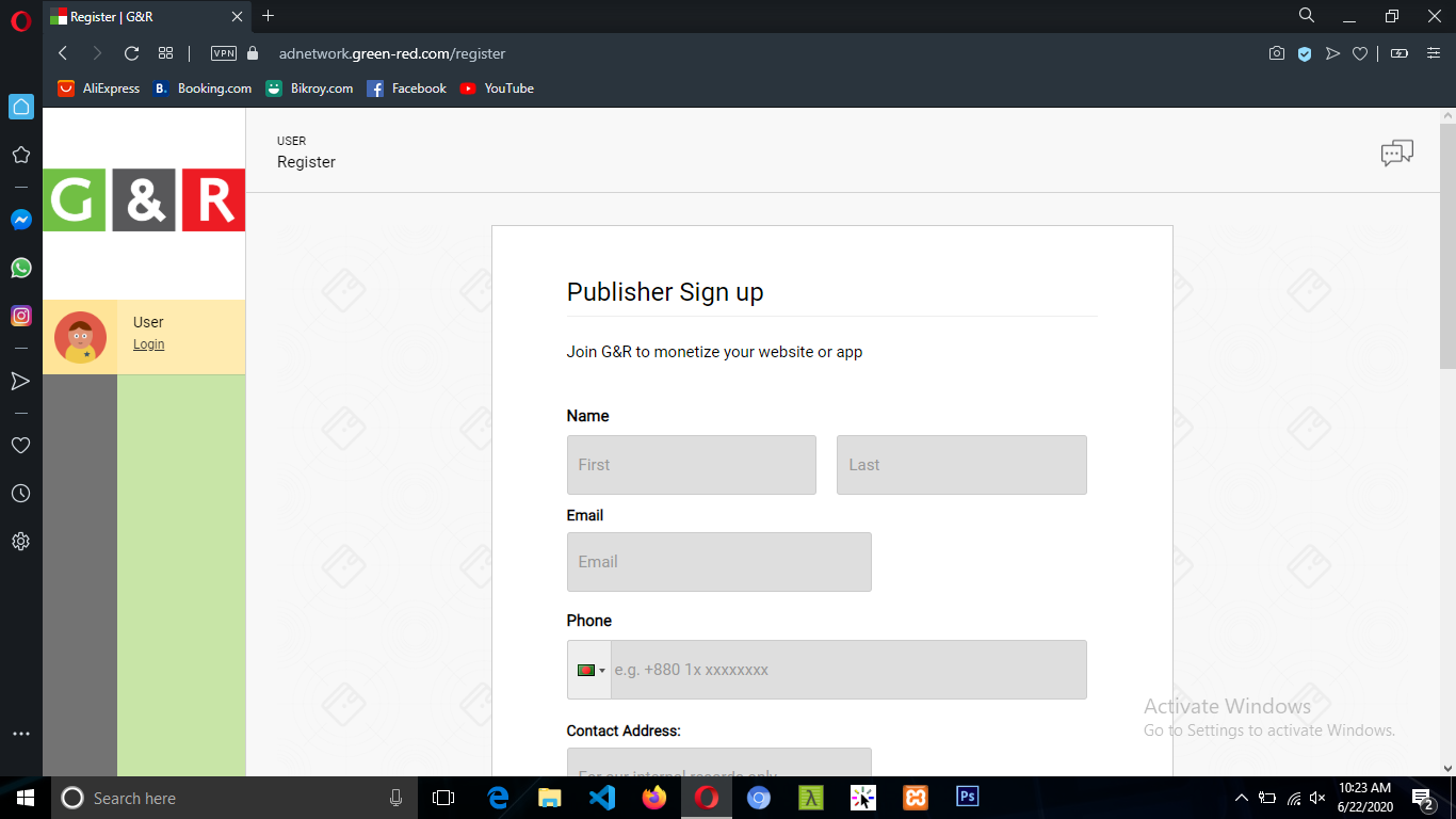 আমরা যে এড নেটওয়ার্কটির কথা বলতেছি তার নাম হচ্ছে গ্রীন রেড। একাউন্ট খোলার জন্য আপনাকে এই লিংকে যেতে হবে। https://adnetwork.green-red.com/register?for=publisher যাওয়ার পর নিচের মতো একটি পেজ দেখতে পাবেন।
