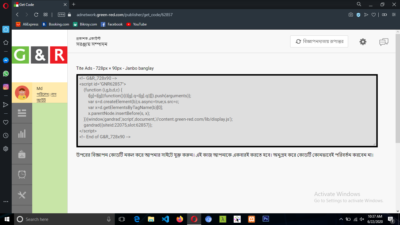 এখান থেকে কোডটি কপি করে আপনার ওয়েব সাইটে বসিয়ে দিলে কিছুক্ষনের মধ্যে এড দেখাবে। আর আপনার ইনকাম শুরু হয়ে যাবে।