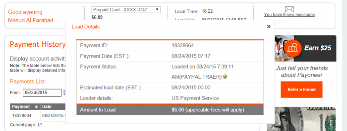 কিছু দিন আগে পেপাল থেকে টাকা পাওনিয়ারে withdraw করা যাচ্ছে না এরকম একটা টিউন করা হয়েছিল। আমি এটা check করার জন্য পেপাল থেকে কিছু টাকা পাওনিয়ারে withdraw করার জন্য request করি। Request করার একদিন পরে তারা আমাকে টাকা payment করে।