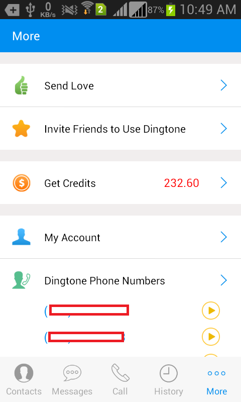 সাইন আপ করলেই আপনাকে ওরা ১৫ ক্রেডিট দিবে। More ট্যাব এ দেখবেন যে Dingtone Phone Numbers আছে, ওখানে আপনি কানাডিয়ান অথবা অ্যামেরিকান নাম্বার কিনতে পারবেন, কিন্তু আপনাকে এর জন্য ১০০ ক্রেডিট খরচ করতে হবে।