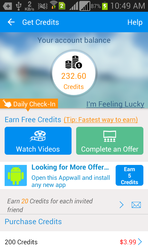 বেক করে Complete an Offer এ ক্লিক করুন। এখানে আপনাকে ওরা কয়েকটা অ্যাপ ইন্সটল করতে বলবে যার বিনিময়ে আপনাকে ওরা ক্রেডিট দিবে, ১-২ ঘণ্টা লাগবে ১০০ ক্রেডিট পেতে। ধরে নিলাম আপনি পেয়ে গেছেন।