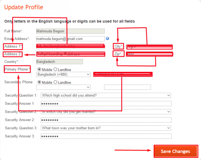 এরপর আপনার সামনে নিচের মতো একটা Page আসবে। এখানেই হল আসল কাজ। নিচের স্কিনশর্ট এ দাগ দেওয়া স্থানগুল হল আপনার ঠিকানা। এখান থেকে আপনি চাইলে Security Question ও পরিবর্তন করতে পারেন। এরপর Save Change এ ক্লিক করুনঃ