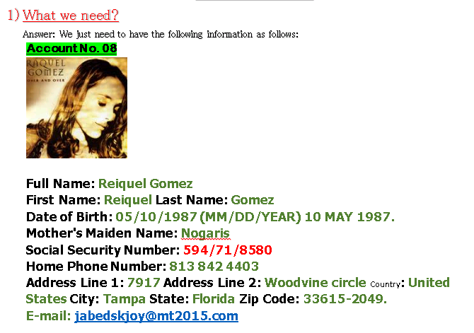 প্রথমে-ই একজন আমেরিকানের নাম, ঠিকানা এবং অবশ্যই সোশাল সিকিউরিটি নম্বর সম্বলিত তথ্য সংগ্রহ করুন। যেমন একটি ভেরীফাইড পেপাল একাউন্ট এর জন্য আমি নীচের তথ্য-টুকু বেছে নিলাম………সঠিক, ফ্রেশ ও ইউনিক তথ্যের উপরই এ পদ্ধতির সফলতা ১০০% নির্ভরশীল।। কারণ পেপ্যাল এর সাথে সংযুক্ত মেটা ব্যাংকের এই চেকিং একাউন্টটি Payoneer এর মতো কোন ভার্চূয়াল ব্যাংক একাউন্ট নয়।। এটি ভিসা গোল্ডেন কার্ড সহ একটি পূর্ণাঙ্গ ও ফিজিক্যাল ইউ.এস ব্যাংক একাউন্ট।।তাই Fakename generator দিয়ে SSN পাওয়া গেলেও তা দিয়ে এই ধরণের ব্যাংক একাউন্ট তৈরী সম্ভব না।।