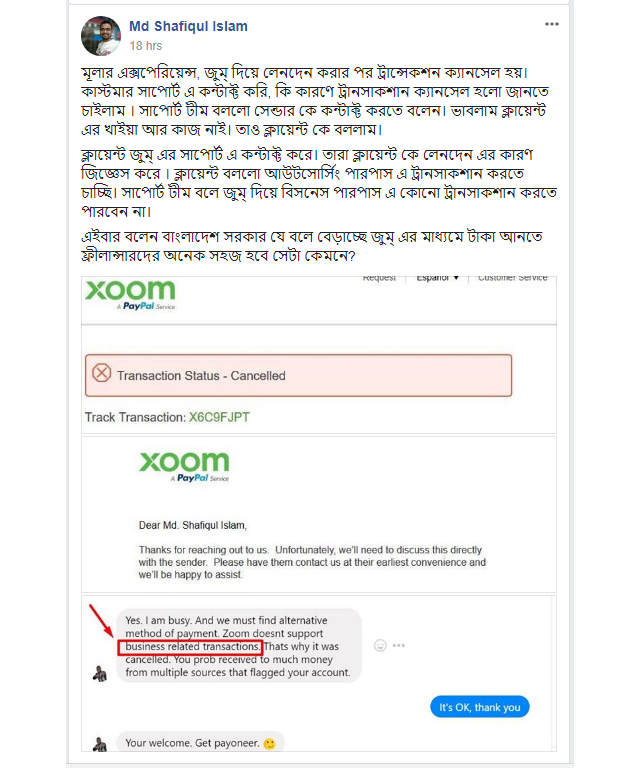 "জুম্ দিয়ে লেনদেন করার পর ট্রান্সেকশন ক্যানসেল হয়। কাস্টমার সাপোর্ট এ কন্টাক্ট করি, কি কারণে ট্রানসাকশান ক্যানসেল হলো জানতে চাইলাম। সাপোর্ট টীম বললো সেন্ডার কে কন্টাক্ট করতে বলেন। ভাবলাম ক্লায়েন্ট এর খাইয়া আর কাজ নাই। তাও ক্লায়েন্ট কে বললাম।