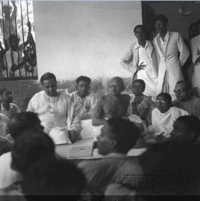 এক ফ্রেমে তিন কিংবদন্তী। মহাত্মা গান্ধী, হোসেন শহীদ সোহরাওয়ার্দী এবং শেখ মুজিব (চশমা চোখে)