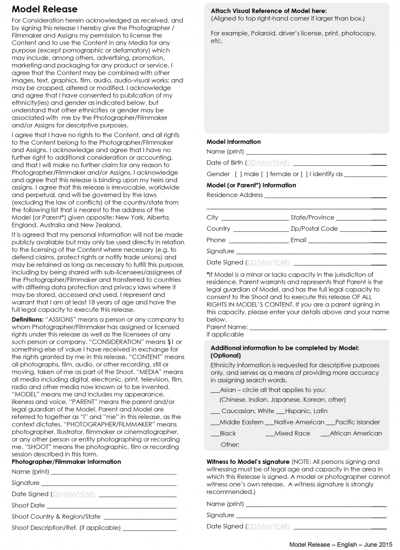রিলিজ ফর্মে বলে দেয়া থাকে যে কি কি কাজে ছবিটা ব্যবহার করা যাবে। ফর্মে ফটোগ্রাফারের কিছু তথ্য দেয়া লাগে এবং মডেল বা প্রোপার্টির কিছু তথ্য দেয়া লাগে। যদি মডেল এর বয়স ১৮ এর নিচে হয় তাহলে মডেল রিলিজ মডেল এর বাবা/মার কাছ থেকে সাইন করিয়ে নিতে হবে। নিচের ছবিগুলো দেখলেই বুঝতে পারবেন একটা মডেল/প্রোপার্টি রিলিজ কেমন হয়?