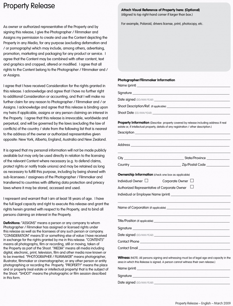 ছবিতে যদি কোন প্রাইভেট প্রোপার্টি থাকে যা ছবি দেখে চেনা যায় সেগুলির জন্য প্রোপার্টি রিলিজের দরকার হয়। যেমনঃ কারো বাড়ি, প্রাইভেট মনুমেন্ট মোট কথা মালিকানাধীন কোন কাঠামো। পাবলিক প্রোপার্টির জন্য সাধারনত কোন রিলিজের দরকার হয় না। যেমনঃ ব্রিজ, রাস্তা, মনুমেন্ট, বাজার ইত্যাদি।