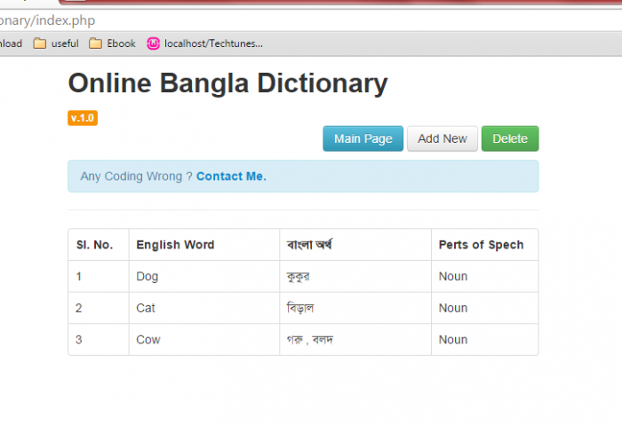 আমাদের এই ওয়েব অ্যাপ্লিকেশনে index.php হচ্ছে আসল পাতা। এখানেই ভিজিটর প্রথম আসবে। আমরা আগের টিউনগুলোতে যা শিখেছি তার ব্যবহারিক প্রয়োগ এখানে করবো। তাই আমরা এখানে সাধারণ একটি এপ্লিকেশন নিয়ে আলোচনা করছি। আমরা পরের টিউনগুলোতে আরো উন্নমানের এপ্লিকেশন নিয়ে আলোচনা করবো। তাই আমরা এখানে কোন প্রকার লগিন সিস্টেম দিতে চাচ্ছি না। এখানে ভিজিটর সরাসরি এসে আমাদের ডিকশোনারী দেখতে পাবে। তাই আমরা এখানে সরাসরি ডাটাবেইজ থেকে আমাদের ডাটা দেখাবো। সবার আগে এর একটি এর একটি স্কিনশট দেখে নিন।