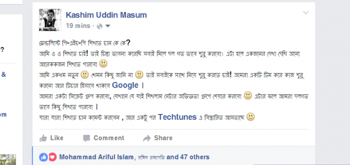 আমি আগে ও বলেছি একার ধারা যা সম্ভব নয়, দশ জনের দ্বারা তা সম্ভব, আমি হয়তো একা থাকার কারনে শিখতে ইচ্ছা হলে অলসতার জন্য শিখতে পারি না, তাই আমি চাচ্ছি দলগত ভাবে শিখা শুরু করবো। মানে আমরা ১০-২০ জন মিলে একটি গ্রুপ তৈরি করবো ফেসবুকে (সিক্রেট) আর এখানে শুদু মাত্র আমরা দশ- বিশ জন থাকবো, আমরা একে অন্যকে সাহায্য করবো, যেমন আমাদের শিক্ষক হিসাবে থাকবে গুগল, আমরা আমাদের ধরকারি টিউটেরিয়াল গুগুল থেকে সংগ্রহ করবো, এতে করে একজনের থেকে দেখে দেখে অন্যজন শিখতে পারবো!
