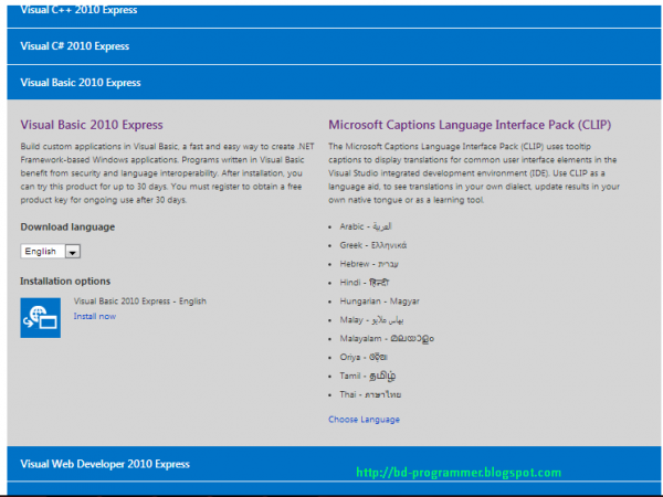৩. ভিজুয়্যাল বেসিক ১০: আমি নিজেই ব্যবহার করি এই ভার্সনটি ভিজুয়্যাল বেসিক ০৮ থেকে অপেক্ষাকৃত বেশি উন্নত। এটার সাইজও অনেক বড়। কিন্তু আপনি চাইলেই পারবেন। শুধু একটু সময় দিন। এটা ডাউনলোড করুন এখান থেকে। আপনি এটাতে অনেক কিছুই পাবেন। বলা হয়ে থাকে যে, ভিজুয়্যাল বেসিকের সবচেয়ে স্ট্যান্ডার্ড ভার্সন হল ২০১০. নিচের চিত্র দেখে ডাউনলোড সিলেক্ট অনলাইন ইনস্টল করুন।