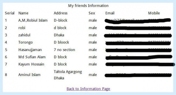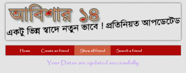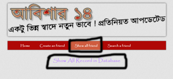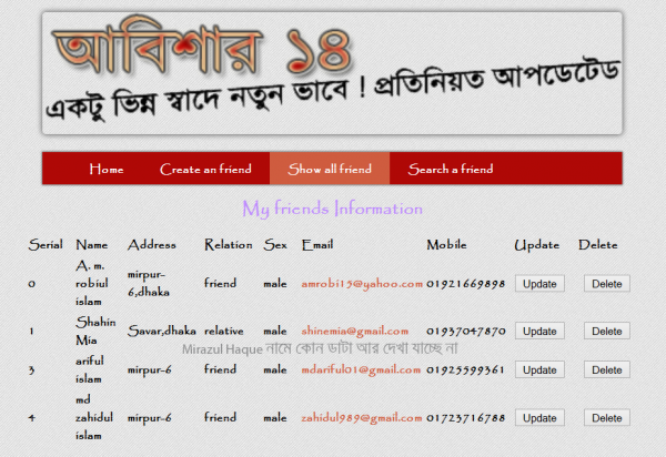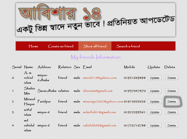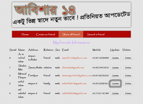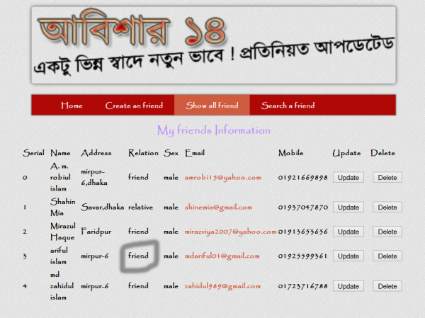 ৫. গত পর্বে আমরা দেখেছিলাম কিভাবে ডাটাবেজ থেকে শর্ত সাপেক্ষে ডাটা খুঁজে বের করা যায়। আজকে আমরা দেখব ডাটাবেজের ডাটা কিভাবে পরিবর্তন এবং ডাটাবেজ থেকে ডাটা ডিলিট করতে পারি। মেনুবার থেকে Show all friend লিঙ্কে ক্লিক করি। নীচের মত দেখতে পাব।