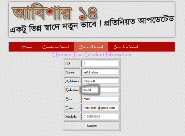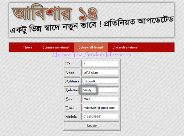 ১৯. এখন দেখুন ariful’র ডাটা গুলো প্রিন্ট করার পাশাপাশি <input /> ট্যাগ দ্বারা ডাটা ইনপুট নেওয়ার জন্য ফিল্ড তৈরি করা হয়েছে। ফলে এখন আমরা ডাটা গুলো পরিবর্তন করতে পারব। একটা বিষয় লক্ষ্য করুন এখানে Id এবং mobile এর ইনপুট ফিল্ড ডিজঅ্যাবল করে রাখা হয়েছে কারন এগুলো পরিবর্তন হোক আমরা এটা চাইনা। আপনি যদি চান তাহলে ডিজঅ্যাবল এর জন্য কোড disabled="disabled" বাদ দিতে পারেন। সব শেষে update বাটনে ক্লিক করলে কি হবে ? যাবতীয় ডাটা গুলো update_process.php পেজে পাঠিয়ে দিবে।
