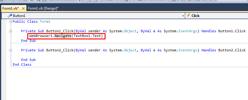 8. আবারও Form1.vb[design] এ এসে Double Click to 'Refresh' button এবং এই কোডটি লিখুন 'WebBrowser1.Refresh()'