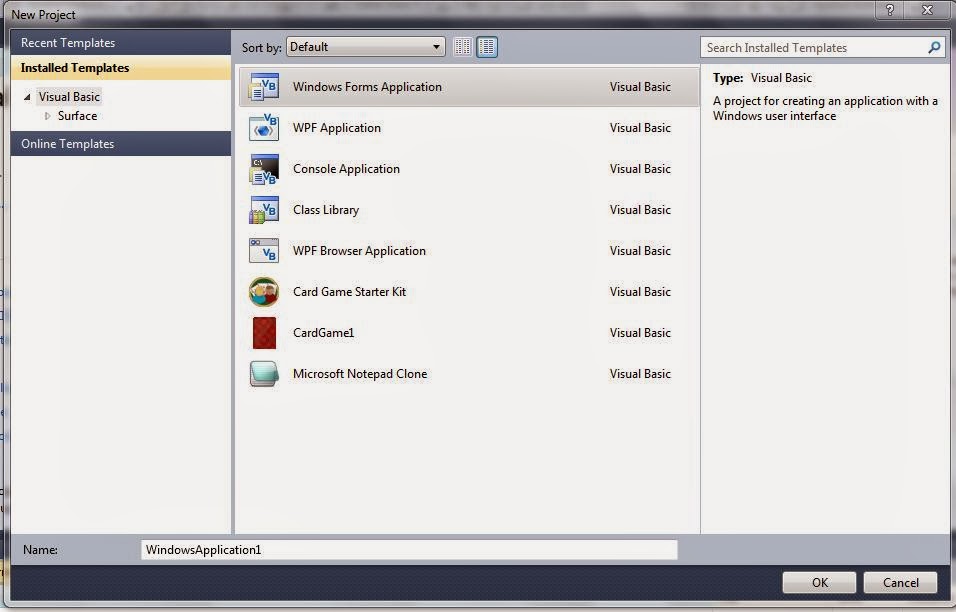 1. ভিজুয়্যাল বেসিকের যেকোন ভার্সন-এর একটা ওপেন করুন। নতুন প্রজেক্ট তৈরি করার জন্য click File>New Project. Select 'Windows Forms Application'. নিচে চিত্রের সাহয্যে দেখানো হল-