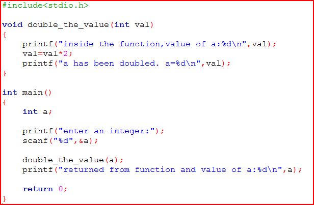 লক্ষ্য করুন, আমরা যখন ভ্যারিএবল বা অ্যারে নিয়ে আলোচনা করেছিলাম তখন আমরা বলেছিলাম যে, যদি কোন ভ্যারিএবল ডিক্লেয়ার করা হয় সেক্ষেত্রে মেমরীতে ঐ ভ্যারিএবল এর জন্য জায়গা তৈরী হয়। ফাংশন কল এর সময় আমরা যখন প্যারামিটার লিস্ট এ কোন ভ্যারিএবল এর নাম উল্লেখ করছি তখন ঐ ভ্যারিএবল এর ভ্যালুটা argument হিসেবে পাস হয়। আর ফাংশন এর ডেফিনেশন এর মধ্যে যে ভ্যারিএবল এর নাম উল্লেখ করা হয়, ঐ ভ্যারিএবল এর মেমরী লোকেশন এ যে argument receive হয় সেই ভ্যালুটাই assign হয়। তাই যখন ফাংশন এ কোন ভ্যারিএবল এর মান ডাবল করা হচ্ছে, তখনঐ ফাংশনের ভ্যারিএবল এর ভ্যালু ডাবল হচ্ছে, কিন্তু main() function এর মধ্যে উল্লেখিত ভ্যারিএবল এর মানের কোন পরিবর্তন হয় না। সেকারনে যখন main() function এ ফেরত আসে, তখন main() function এর ভ্যারিএবল এর ভ্যালুর কোন পরিবর্তন দেখা যায় না।