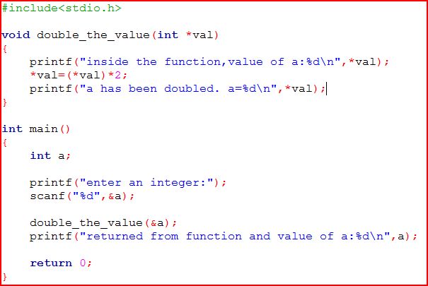 এবার আমরা উদাহরনটি নিয়ে আলোচনা করি। উদাহরনটিতে ফাংশন এর প্যারামিটার ভ্যালু হিসেবে শুধুমাত্র a এর ভ্যালু পাঠানো হয়েছে। আর ফাংশন এর মধ্যে ঐ ভ্যালুটি ডাবল হলেও সেই ডাবল ভ্যালুটি শুধুমাত্র ঐ ফাংশন এর মধ্যেই কার্যকর। তাই যখন main() function এ ফেরত এসেছে তখন a এর ভ্যালু হিসেবে ফাংশন এ যাওয়ার সময় যে ভ্যালু ছিল তাই থাকবে।