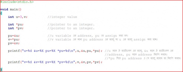 নিচের প্রোগ্রামটি ও তার কমেন্ট এবং রান করে আউটপুট দেখলে pointer সম্পর্কে প্রাথমিক ধারনা পেয়ে যাবেন।